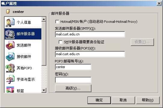 在“POP3服务器(P)”后键入:mail.cust.edu.cn;在“POP3账户名(A)”后键入您的用户账号,比如:center;在“SMTP服务器(S)”后键入:mail.cust.edu.cn